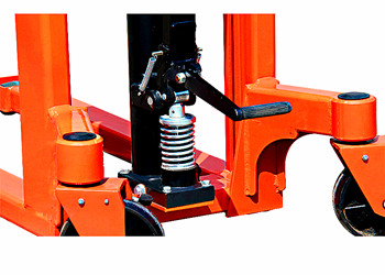 門架采用優質型鋼焊接而成,剛性好、強度高。后輪使用帶剎車裝置的萬向輪,可自由旋轉、轉動輕便靈活,前后輪均以滾珠軸承安裝于輪軸上,轉動靈活。車輪為尼龍輪,耐磨、耐用,且不易損壞工作地面。手動液壓堆垛車